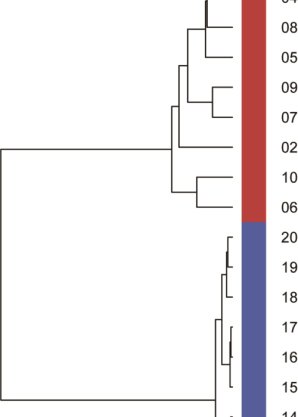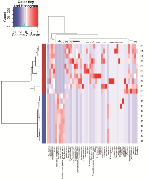 • 群集組成をヒートマップで表し、検体間のユークリッド距離に基づきクラスタリング (ヒートマップ・クラスター分析)