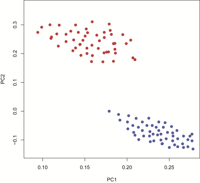 検体間の相関行列を基に、主成分分析を行います。群集組成の特徴を、分散が最も大きい二変量に縮約し、二次元プロットへ投影します。